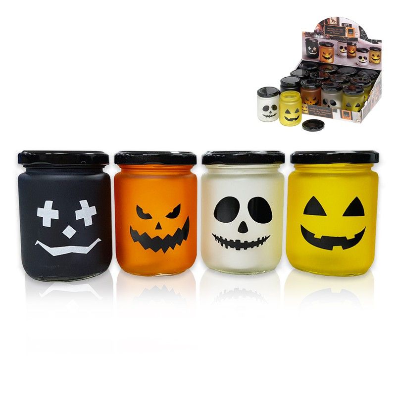Castiçal de vidro com tampa halloween euro / u (4 modelos diferentes - vela led - funciona com 1 bateria cr2032 incluída)