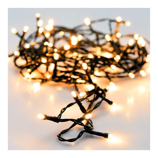 Guirlanda multifuncional 80 LEDs brancos quentes 220v 13m IP44 cabo verde 10cm entre lâmpadas LED de 5mm Programador de 8 funções com adaptador de memória CE Cabo de alimentação de 3m. Distância entre a primeira lâmpada e os últimos 6m. Comprimento total: 9m.