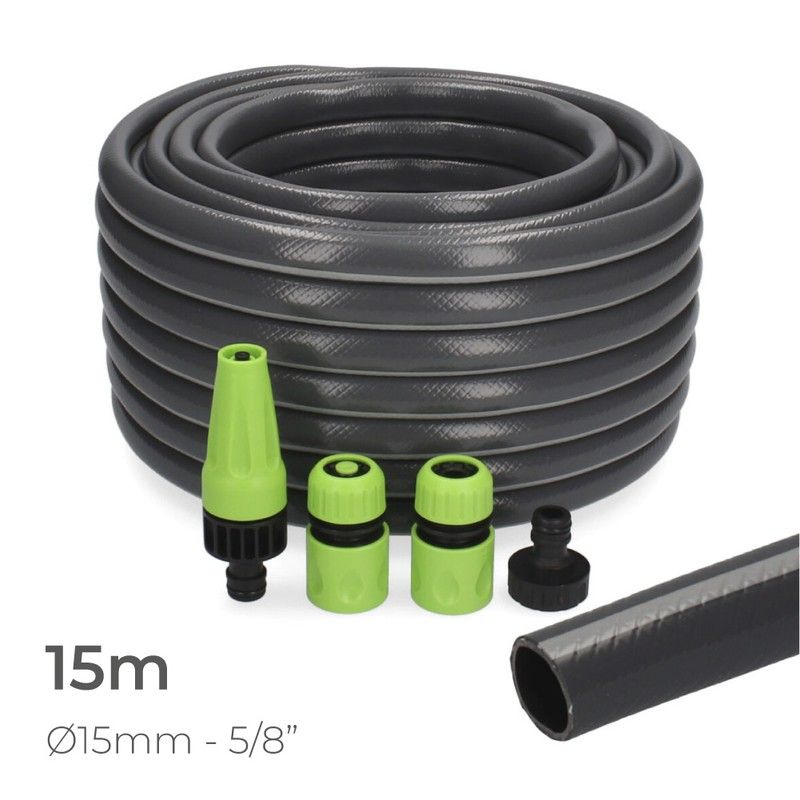 Kit de mangueira de jardim Ecolight em PVC, ø interior 15mm, ø exterior 20mm (5/8"), rolo de 15m com acessórios. Características: 20 bar, temperatura de funcionamento +50° - 10°, tratamento anti-UV resistente, flexível, para todas as estações , antialgas