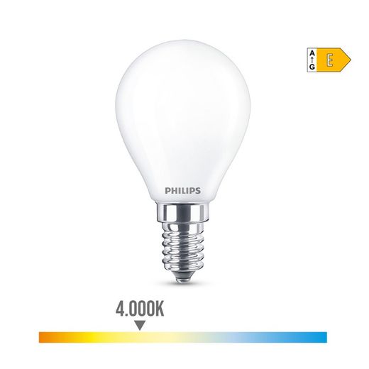 Lâmpada esférica LED e14 6,5w 806lm 4000k luz natural: ø4,5x8cm (diâmetro/altura) 15000h, ac 220-240v classe energética a++ vidro fosco, não regulável, irc:80. Ângulo de abertura de 360°. Classe e. Equivalência: 60w. Philips
