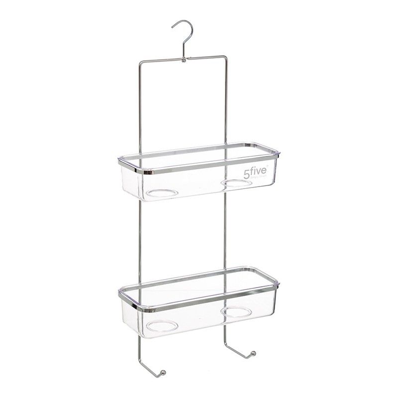 Organizador de chuveiro em polipropileno transparente com duas bandejas. Medida total: 48cm de altura.