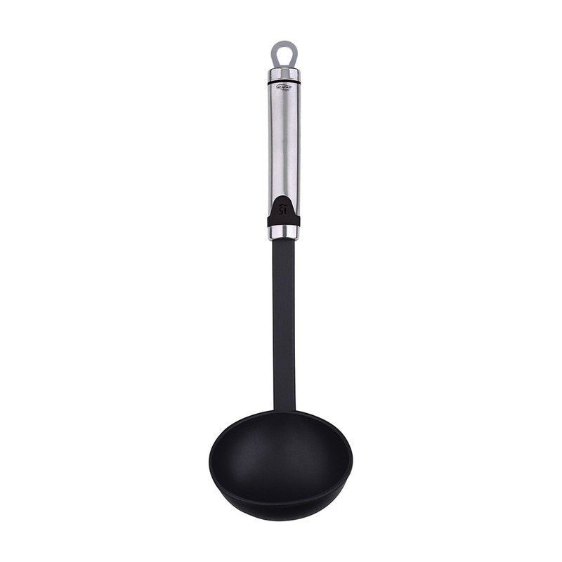 Panela de sopa especialista sg7350 san ignacio. Concha de sopa com cabo em aço inox pbt 32,5x9,7cm cabo 120ml com inserto preto