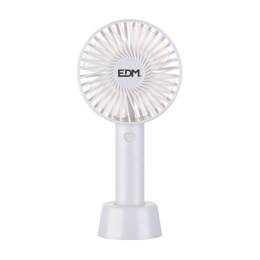 Ventilador de mão recarregável de 4,5 W. 3 velocidades, bateria recarregável USB de 2.000 mAh. Grade de segurança. Não oscilando. Tempo de carregamento: 3h. Autonomia até 5 horas. Medidas: ø10,6x21,3cm (diâmetro/altura) edm